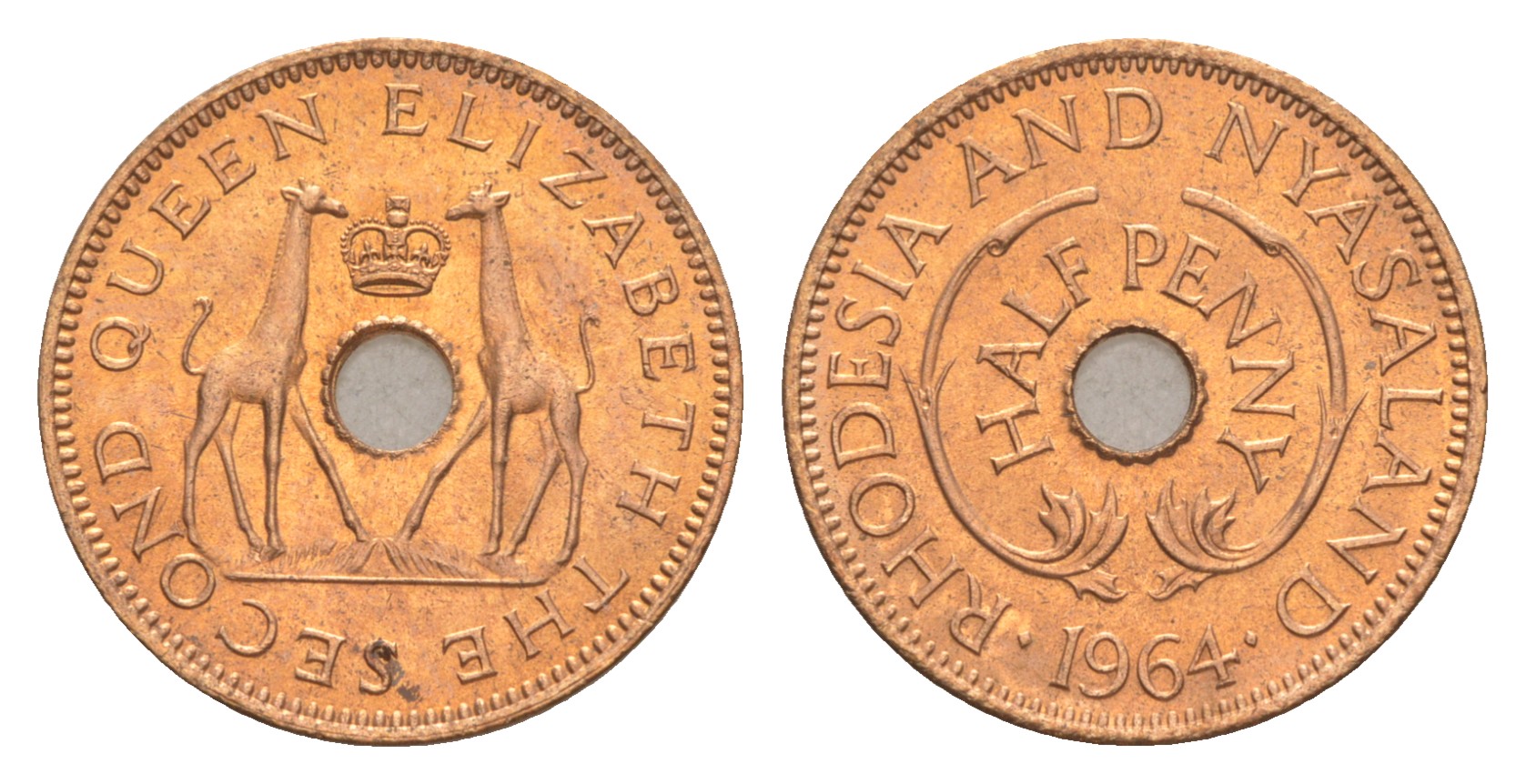 Родезия и Ньясаленд 1/2 пенса 1964 Елизавета II (1952-2022), жирафы KM 1 бронза UNC 4640-868