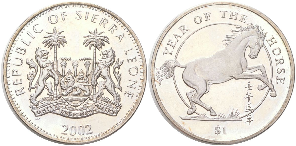Сьерра-Леоне 1 доллар 2002 Год лошади KM 256 медно-никель BU 4368-1034