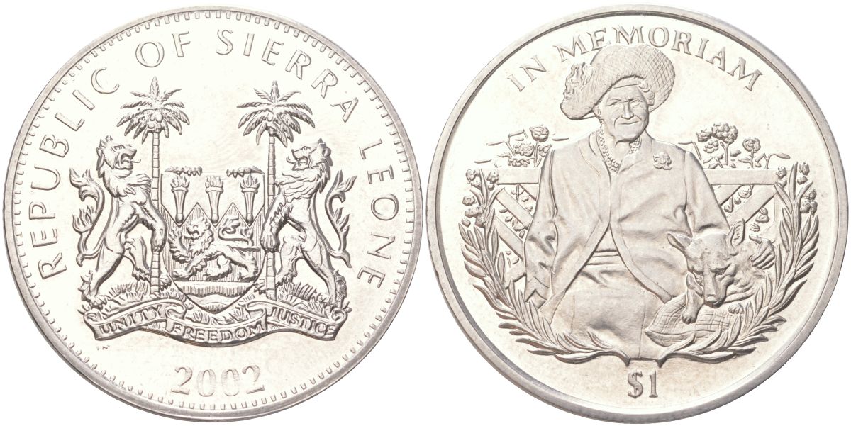 Сьерра-Леоне 1 доллар 2002 Королева-мать с собакой KM 276 медно-никель BU 4368-1115