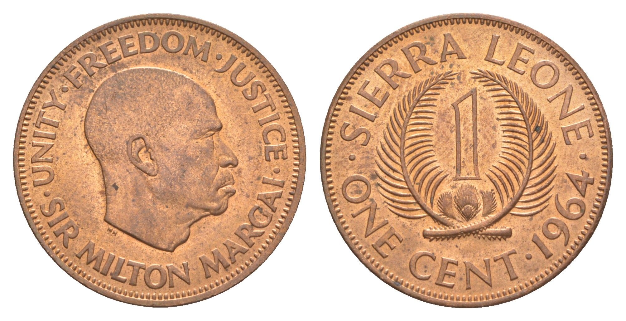 Сьерра-Леоне 1 цент 1964 Милтон Маргаи KM 16 бронза UNC 4610-822