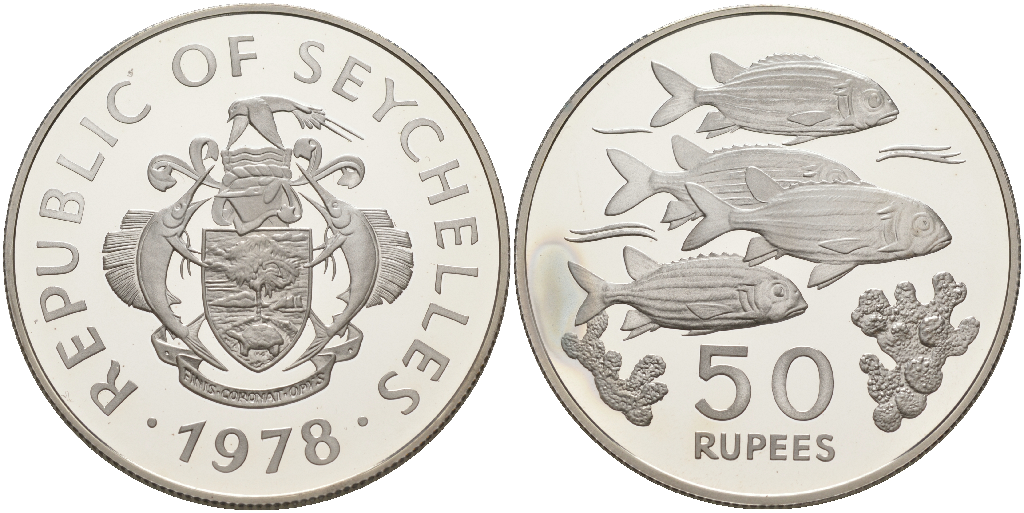 Сейшельские острова 50 рупий 1978 серия защита окружающей среды, рыбы, тираж 4281 экз. KM 39 серебро PROOF 1074-4-43