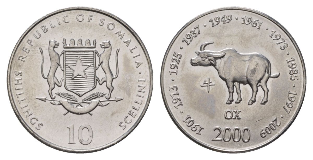 Сомали 10 шиллингов 2000 Китайский гороскоп - год быка KM 91 сталь плакированная никелем UNC 4626-416