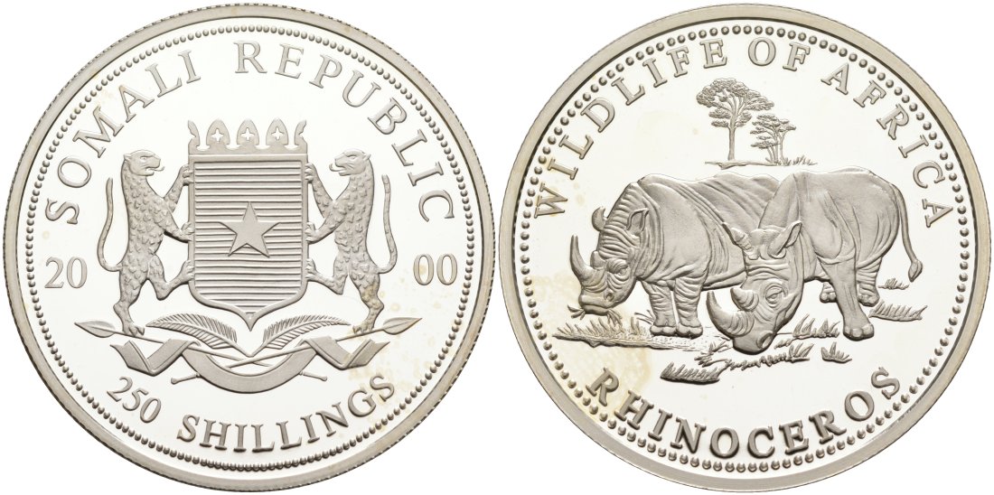 Сомали 250 шиллингов 2000 ДИКАЯ ПРИРОДА АФРИКИ, НОСОРОГ KM 279 серебро PROOF 00-000-00
