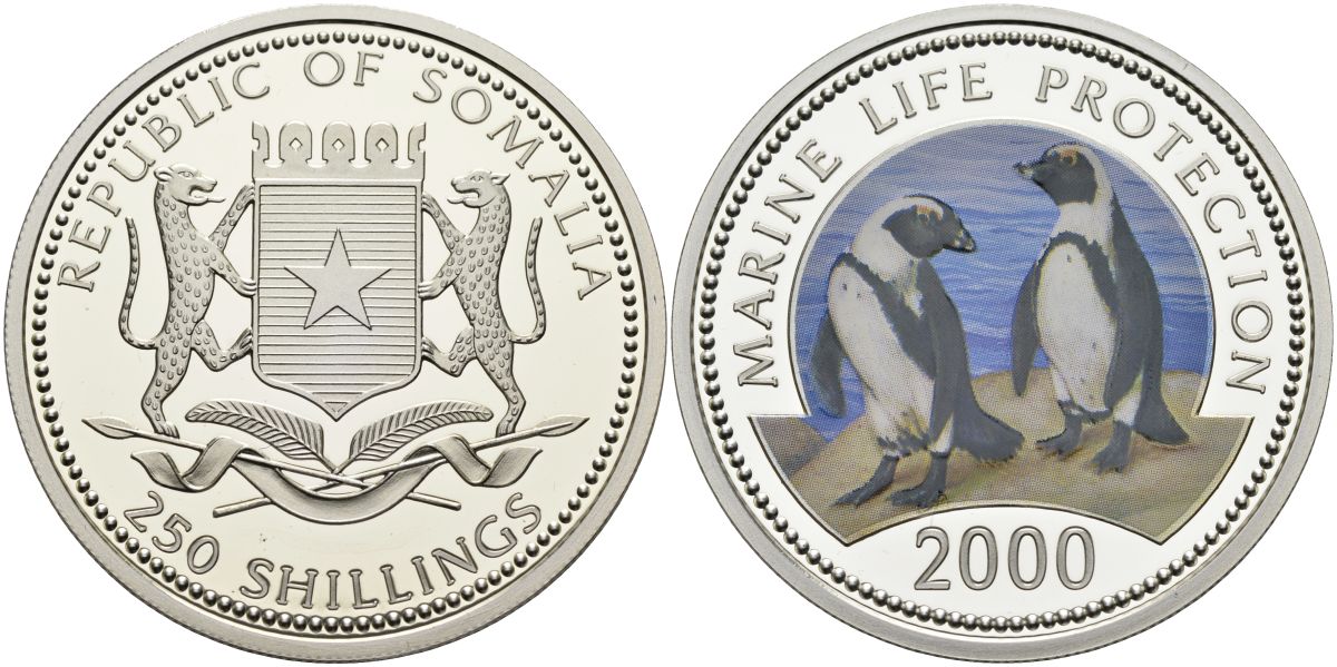 Сомали 250 шиллингов 2000 серия Защита морской жизни, пингвины Гумбольдта, цветная эмаль, тираж 5000 экз. KM 63 серебро PROOF 1098-3-63