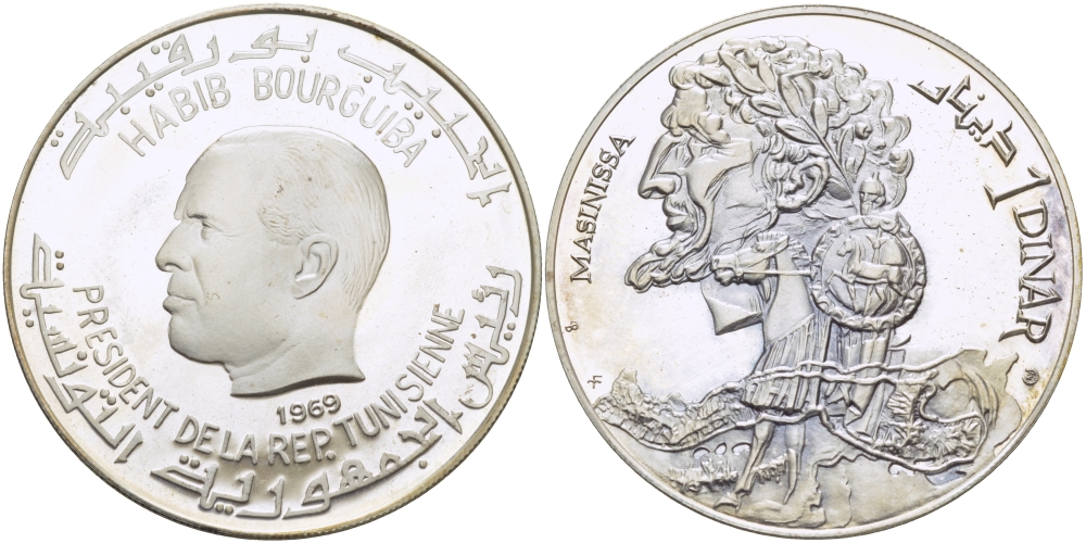 Тунис 1 динар 1969 Хабиб Бургиба, Массинисса, первый царь Нумидии KM 293 серебро PROOF 00-00-00