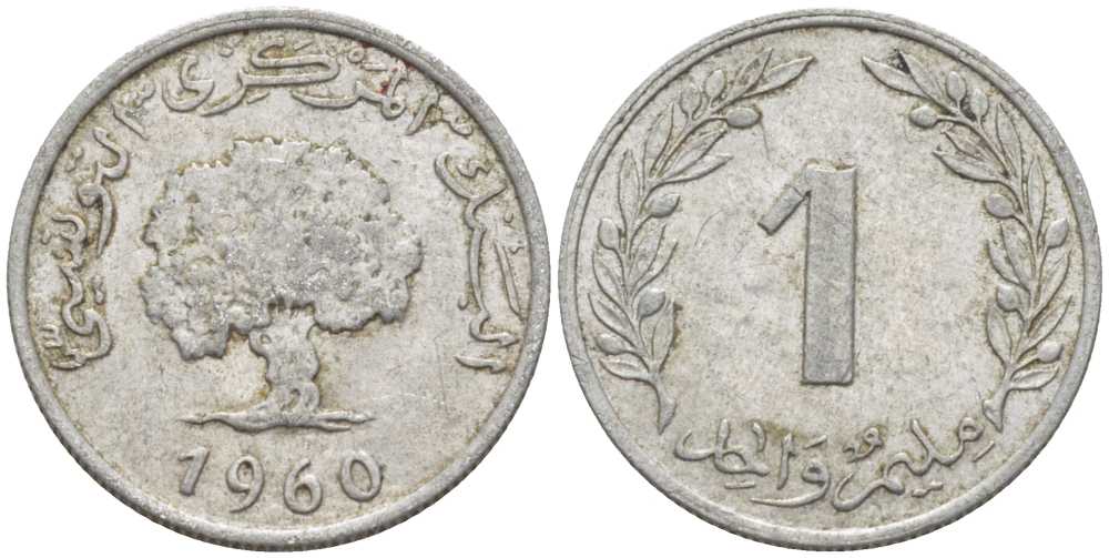 Тунис 1 миллим 1960 пробковый дуб KM 280 алюминий 105-834