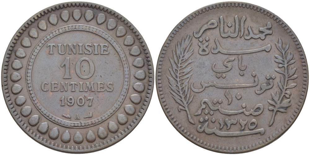 Тунис 10 сантимов 1907 АН1325, Мухаммад V ан-Насир KM 236 бронза 4526-216