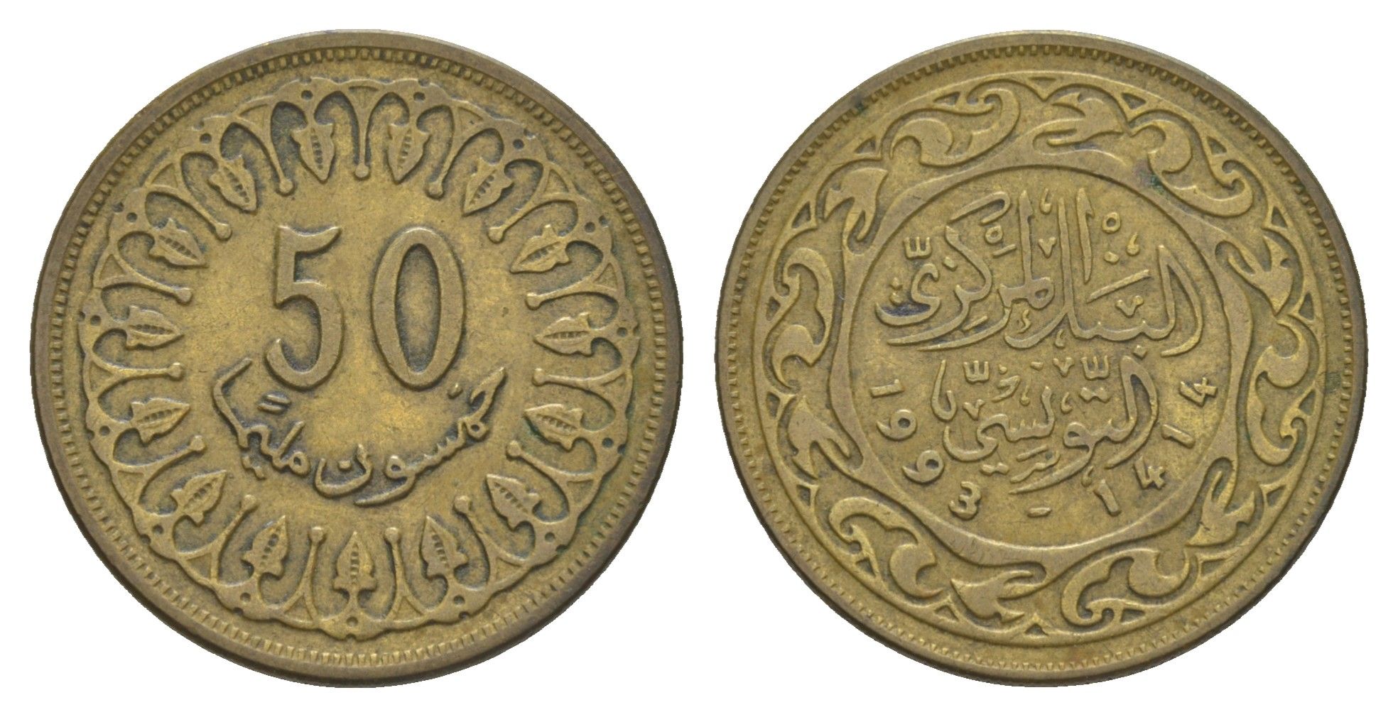 Тунис 50 миллимов 1993 АН 1414 KM 308 латунь 4546-915
