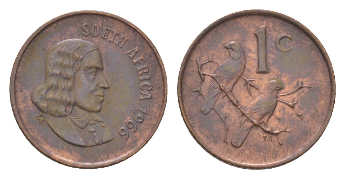 ЮАР 1 цент 1966 Ян ван Рибек (1619-1677), South Africa, легенда на африкаанс, капские воробьи KM 65.1 бронза 4627-156