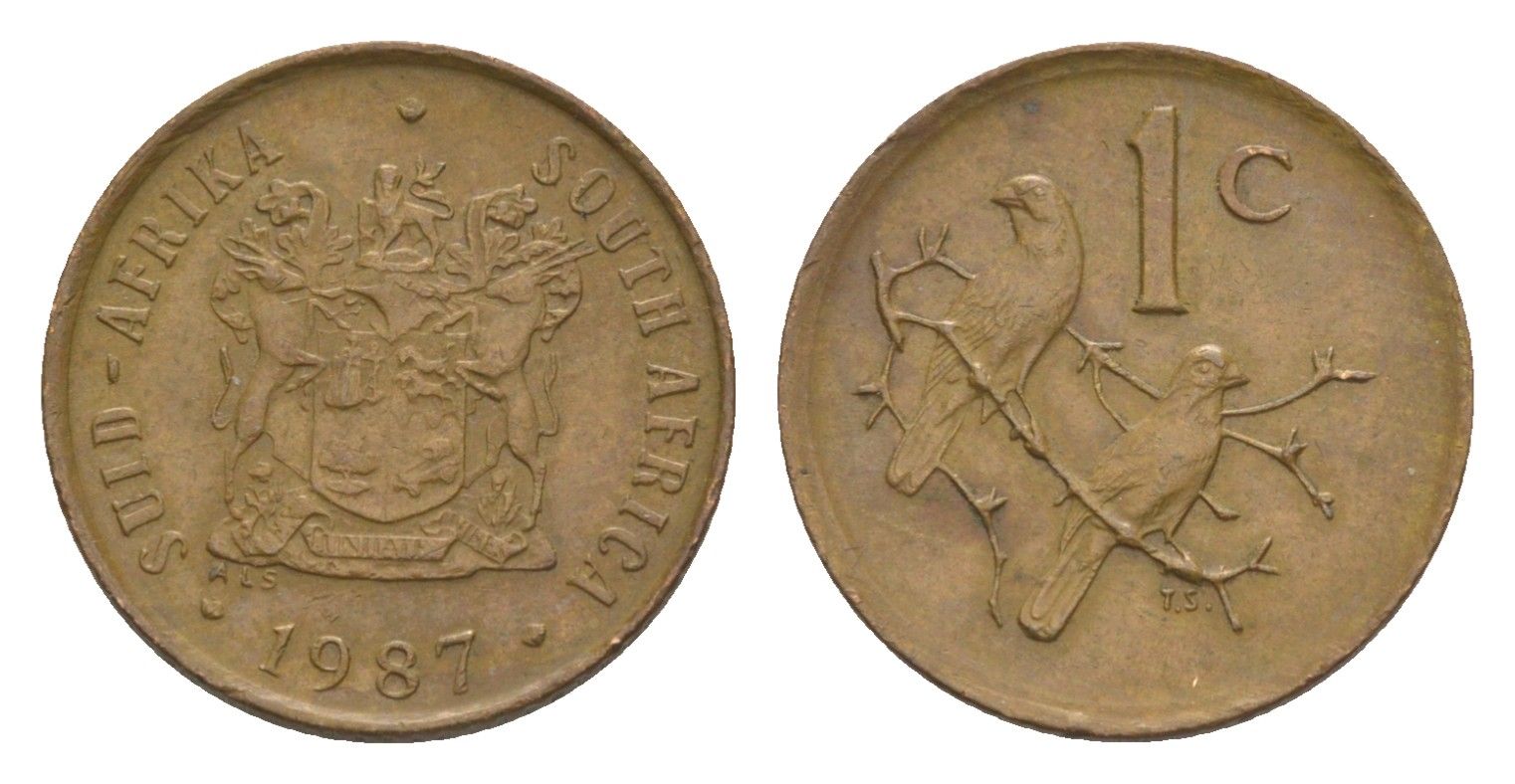 ЮАР 1 цент 1987 герб, капские воробьи KM 82 бронза 4608-542