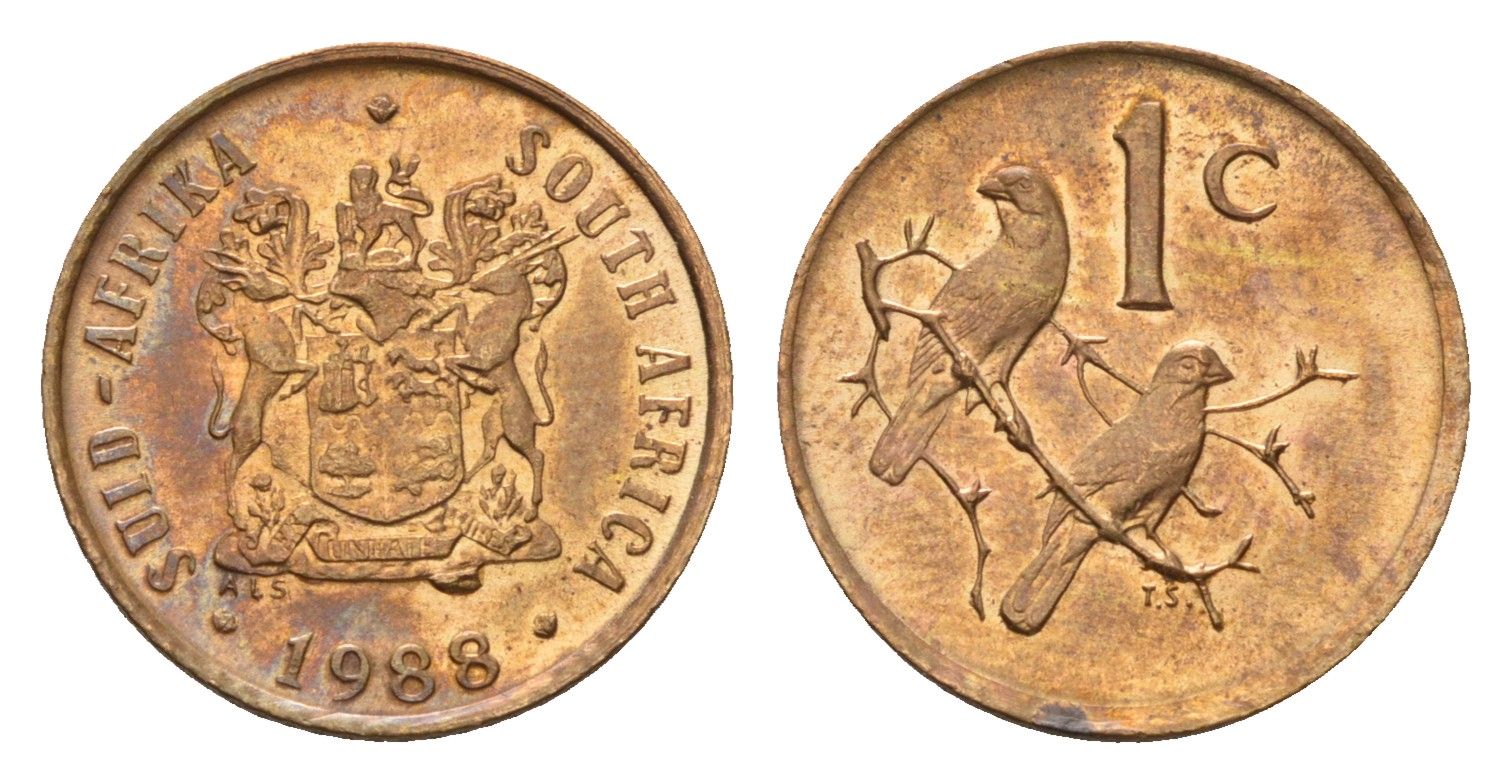 ЮАР 1 цент 1988 герб, капские воробьи, первый год KM 82 бронза UNC 4643-257
