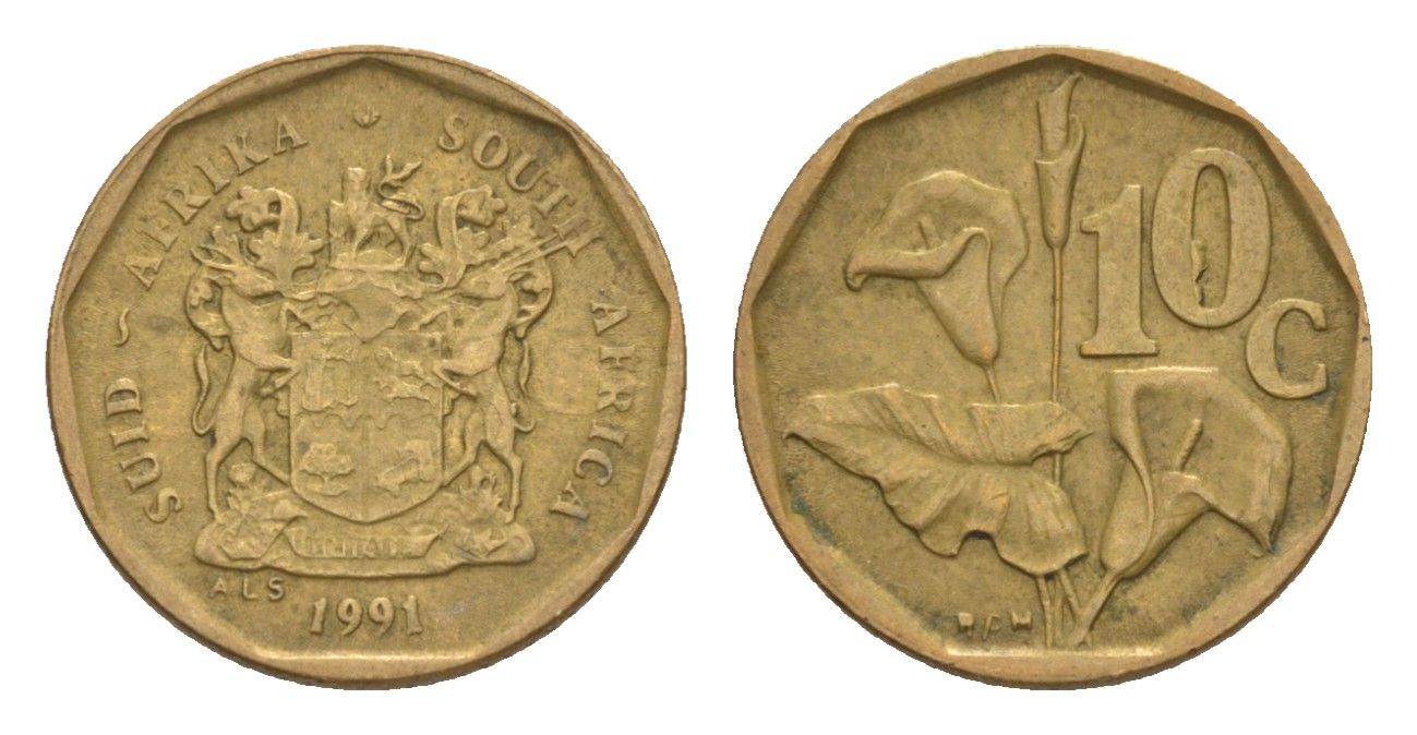 ЮАР 10 центов 1990 герб, цветок алоэ KM 135 сталь плакированная бронзой 4596-167
