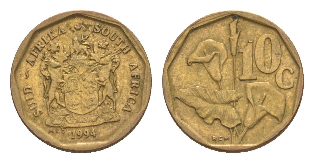 ЮАР 10 центов 1994 герб, цветок алоэ KM 135 сталь плакированная бронзой 4596-211