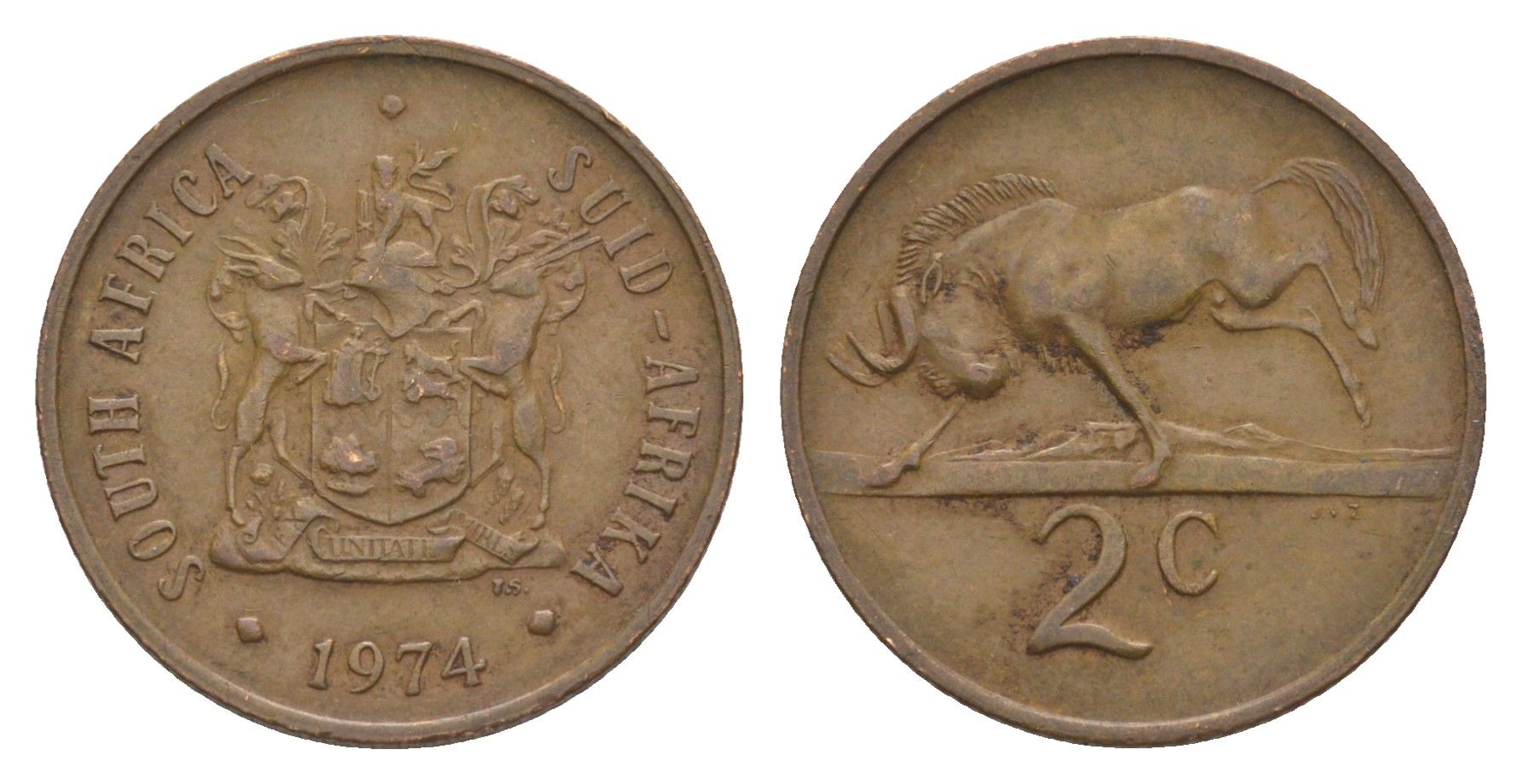 ЮАР 2 цента 1974 герб, антилопа гну KM 83 бронза 4602-645