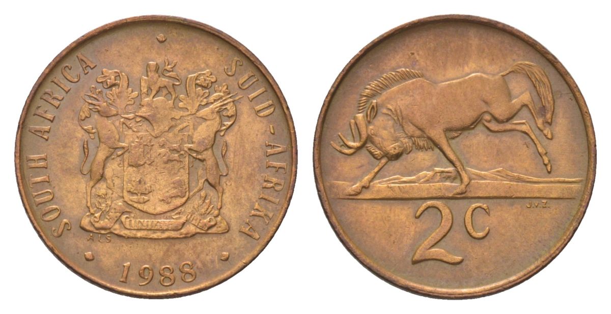 ЮАР 2 цента 1988 герб, антилопа гну KM 83 бронза 4627-167