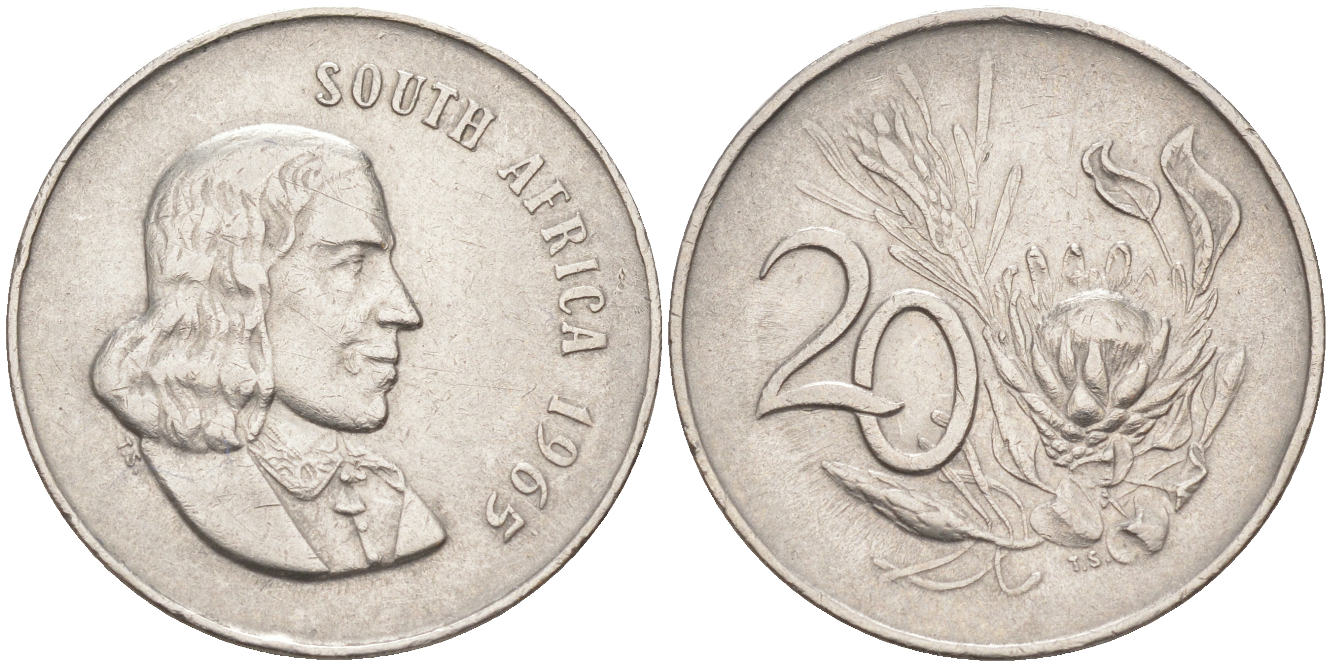 ЮАР 20 ЦЕНТОВ 1965 SOUTH AFRICA, ЯН ВАН РИБЕК (1619-1677), ГОЛЛАНДСКИЙ ИССЛЕДОВАТЕЛЬ , МОРЕПЛАВАТЕЛЬ, ОСНОВАТЕЛЬ Г. КЕЙПТАУНА, ЦВЕТОК ПРОТЕЯ KM 69.1 никель 4539-236