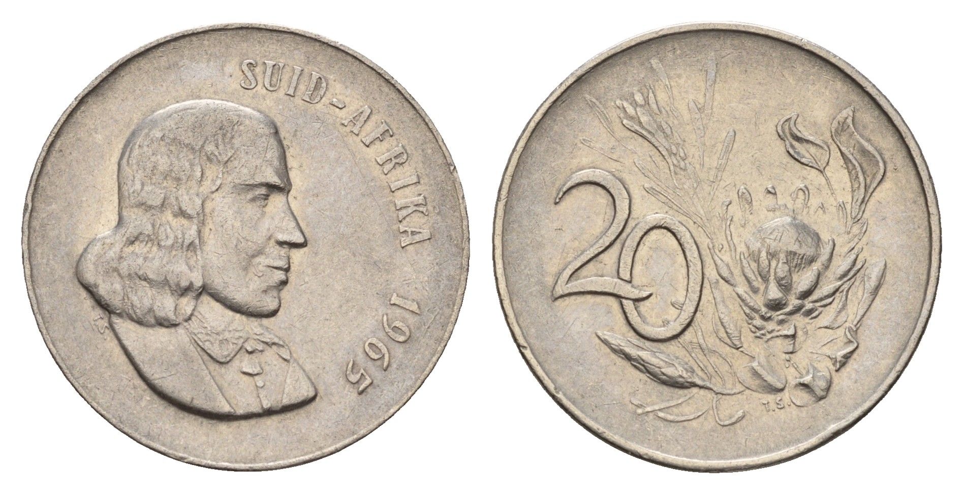ЮАР 20 центов 1965 Ян ван Рибек (1619-1677), Suid Africa, легенда на африкаанс, цветок протея KM 69.2 медно-никель 4114-554
