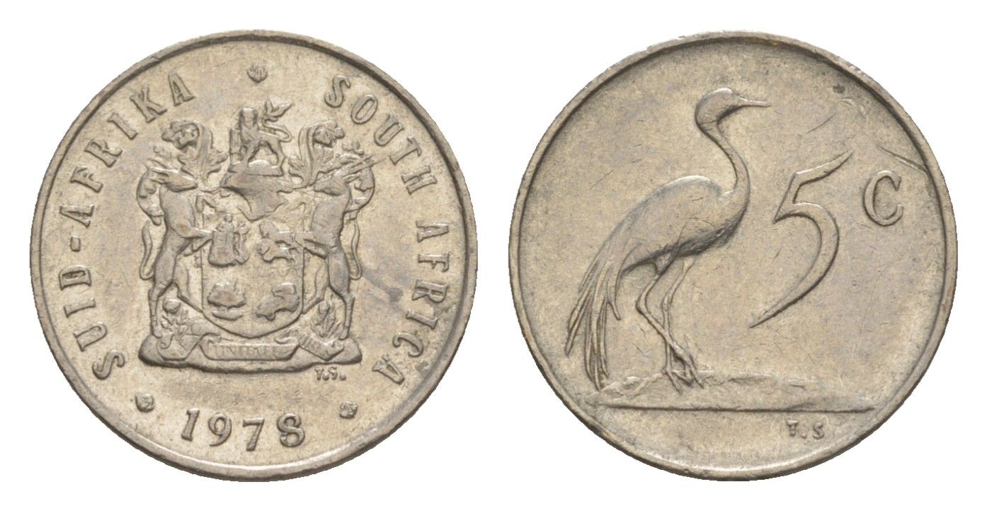 ЮАР 5 центов 1978 герб, райский журавль KM 84 никель 4602-1246