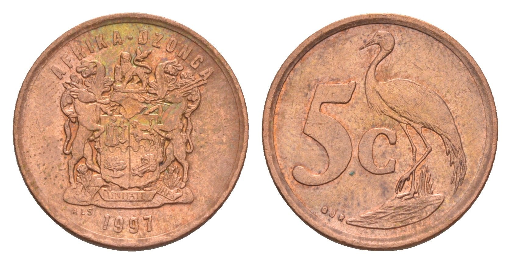 ЮАР 5 центов 1997 герб, райский журавль KM 160 сталь плакированная медью aUNC 4364-3668