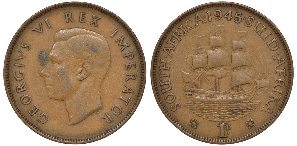 Южная Африка 1 пенни 1945 Георг VI KM 25 бронза 4162-221