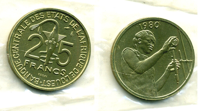 ЗАПАДНО-АФРИКАНСКИЕ ШТАТЫ 25 ФРАНКОВ 1980 ПРОБА, ESSAI, в оригинальной упаковке КМ E9 алюминевая бронза UNC 5010-244