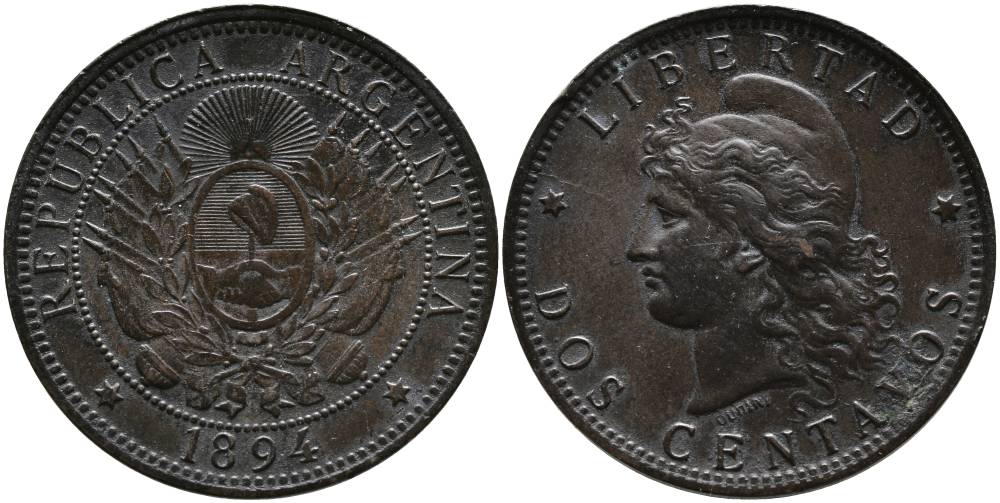 Аргентина 2 сентаво 1894 голова свободы влево KM 8 бронза 4531-1214