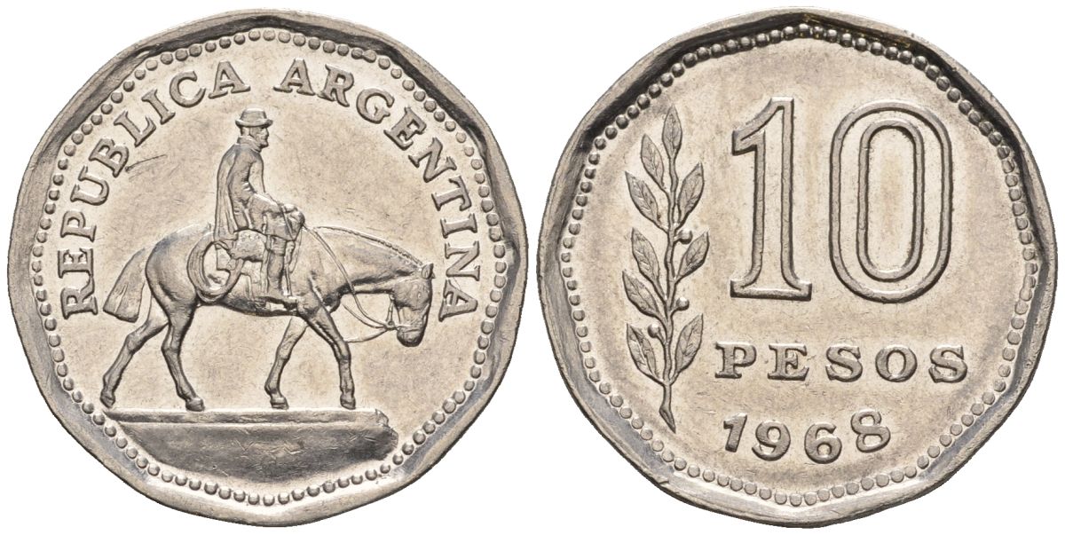 Аргентина 10 песо 1968 Гаучо KM 60, Schon 60, CJ 287 никелированная сталь 60-946