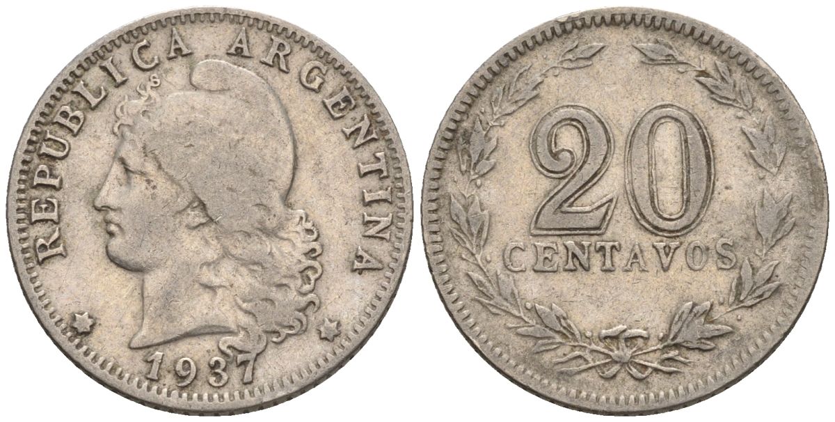 Аргентина 20 сентаво 1937 голова свободы влево KM 36, CJ 84, Schon 39 медно-никель 60-914