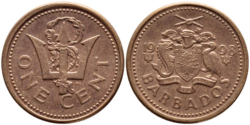 БАРБАДОС 1 ЦЕНТ 1998 СЛОМАННЫЙ ТРЕЗУБЕЦ БРИТАНИИ KM 10а цинк плакированный медью 4398-615