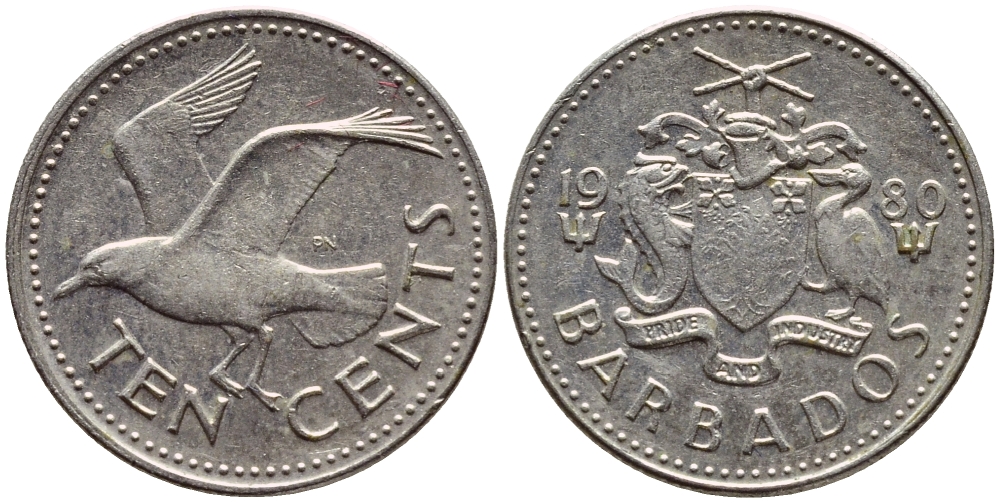 БАРБАДОС 10 ЦЕНТОВ 1980 СМЕЮЩАЯСЯ (АЦТЕКСКАЯ) ЧАЙКА KM 12 медно-никель 4396-1224