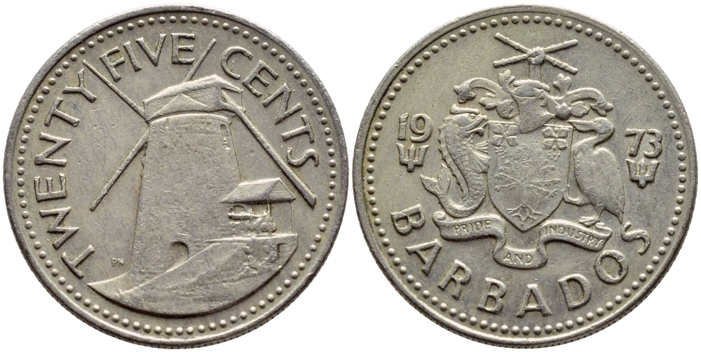 БАРБАДОС 25 ЦЕНТОВ 1973 МЕЛЬНИЦА МОРГАНА ЛЬЮИСА, ПЕРВЫЙ ГОД KM 13 медно-никель 4398-312