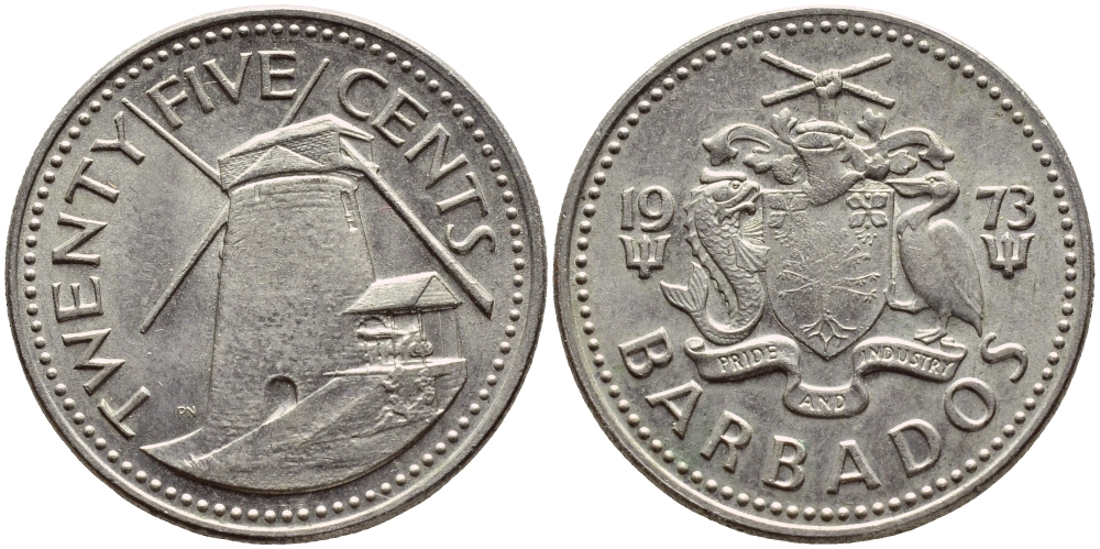Барбадос 25 центов 1973 ветряная мельница Моргана Льюиса KM 13 медно-никель 4398-334