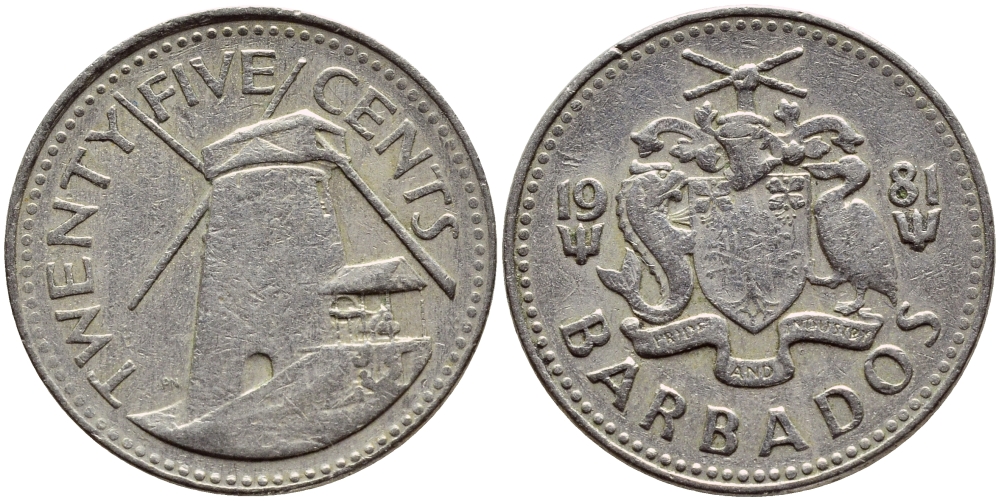 БАРБАДОС 25 ЦЕНТОВ 1981 МЕЛЬНИЦА МОРГАНА ЛЬЮИСА KM 13 медно-никель 4398-413