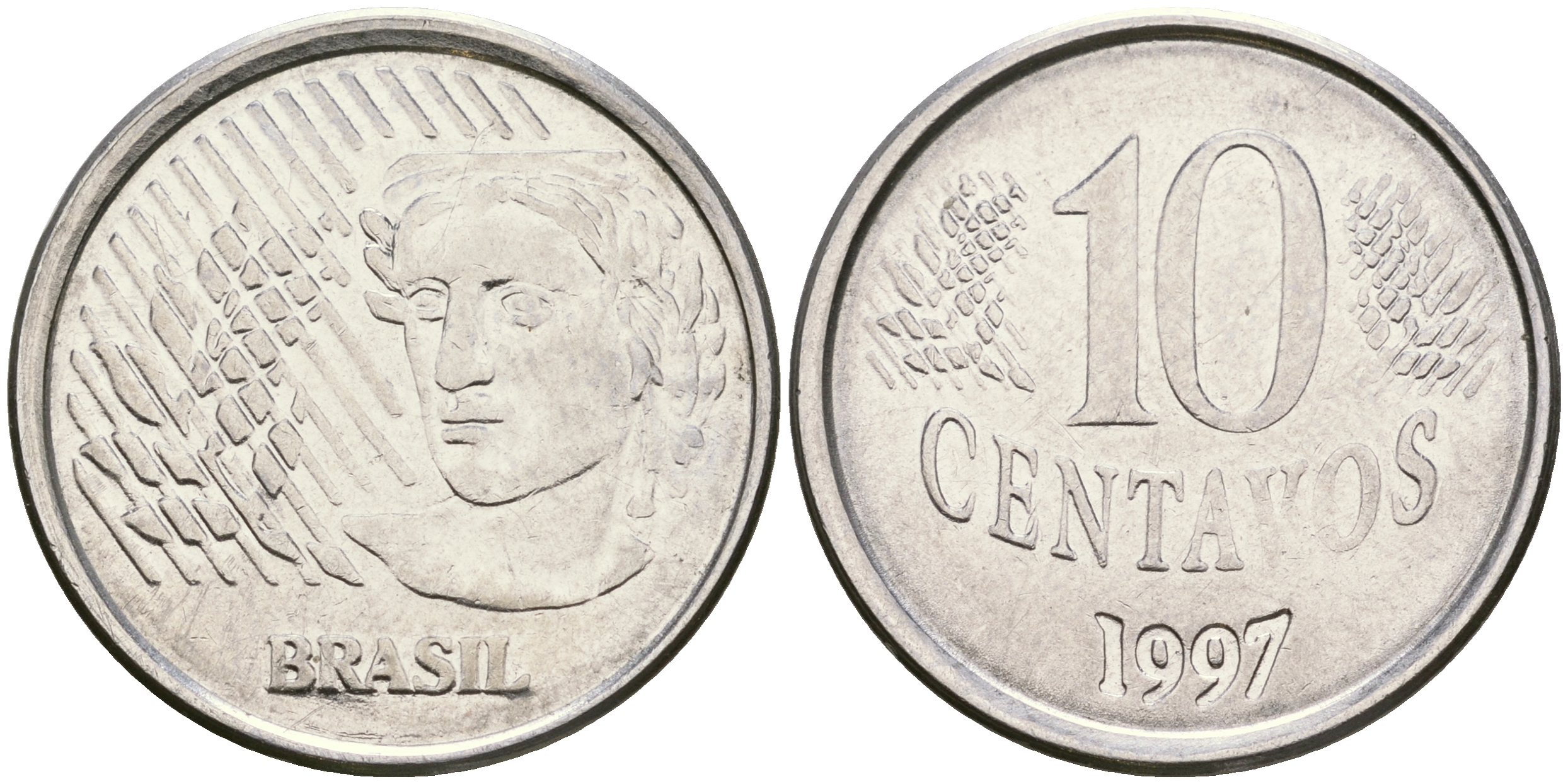 Бразилия 10 сентаво 1997 голова свободы KM 633 нержавеющая сталь 87-444