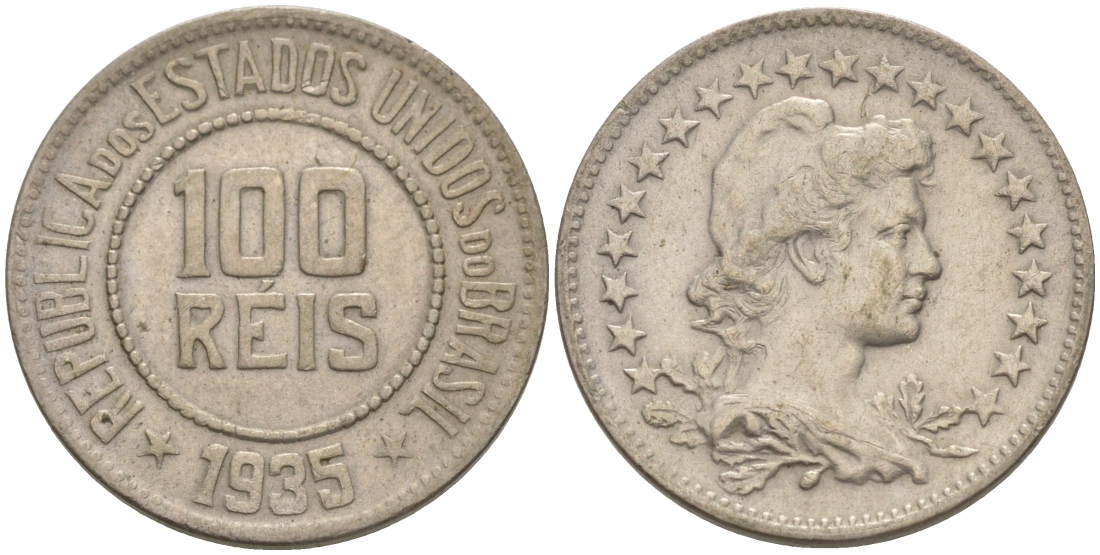 БРАЗИЛИЯ 100 РЕЙС 1935 ГОЛОВА СВОБОДЫ ВПРАВО KM 518 медно-никель 68-724