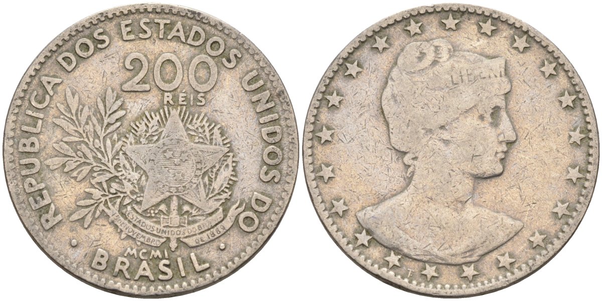 Бразилия 200 рейс 1901 голова свободы вправо KM 504 медно-никель 4589-1121