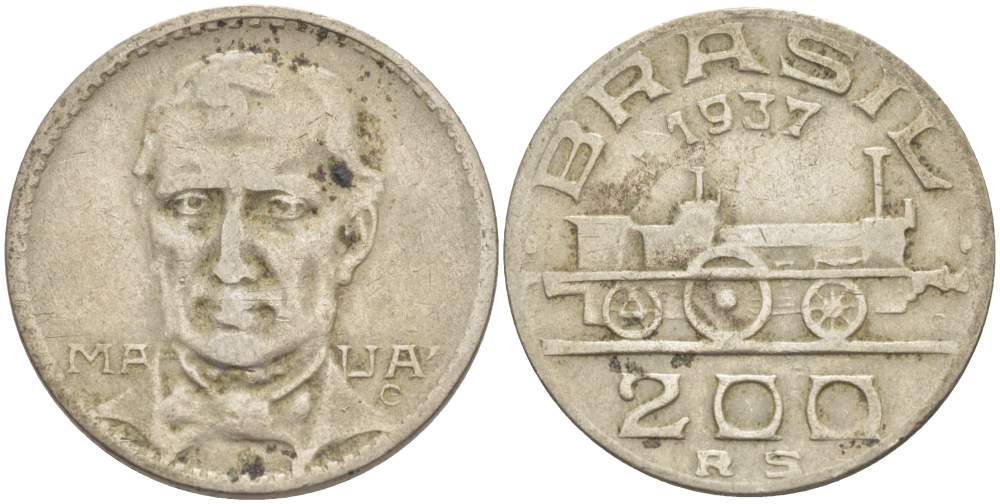 БРАЗИЛИЯ 200 РЕЙС 1937 БРАЗИЛЬСКИЙ ПРОМЫШЛЕННИК, СТРОИТЕЛЬ ПЕРВОЙ ЖЕЛЕЗНОЙ ДОРОГИ ВИКОНТ ди МАУА (1813-1889), ПАРОВОЗ KM 537 медно-никель 4529-557