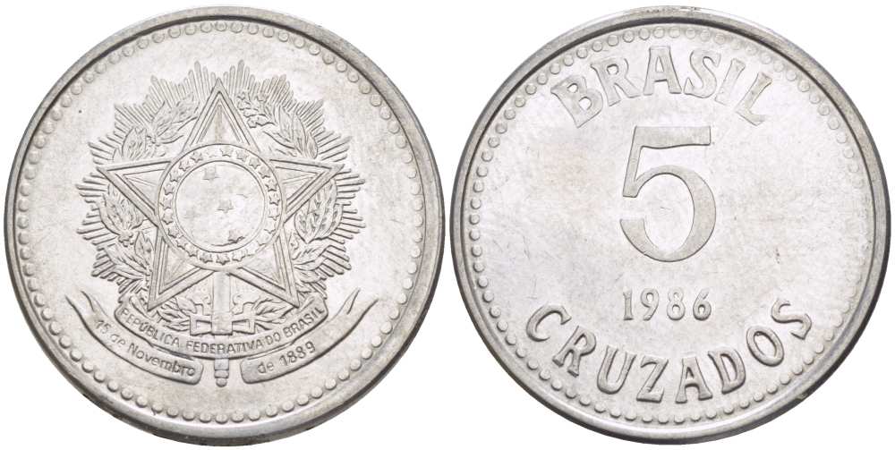 Бразилия 5 крузадо 1986 реформа (1986-1989) KM 606 нержавеющая сталь 28-857