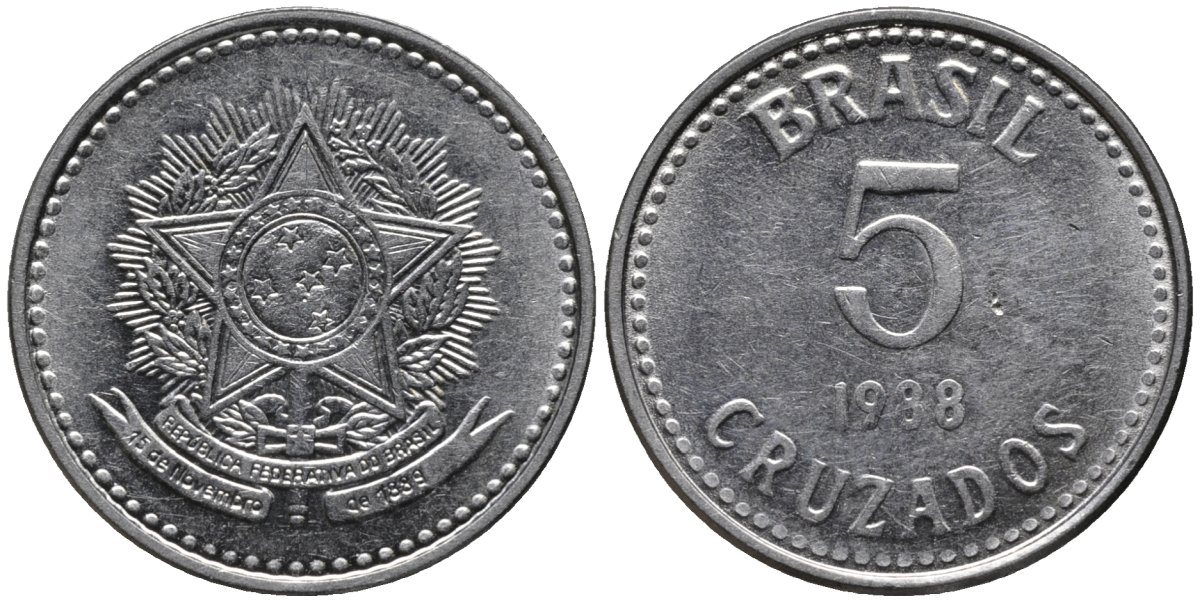 Бразилия 5 крузадо 1988 реформа 1986-1989 KM 606 нержавеющая сталь 4577-625