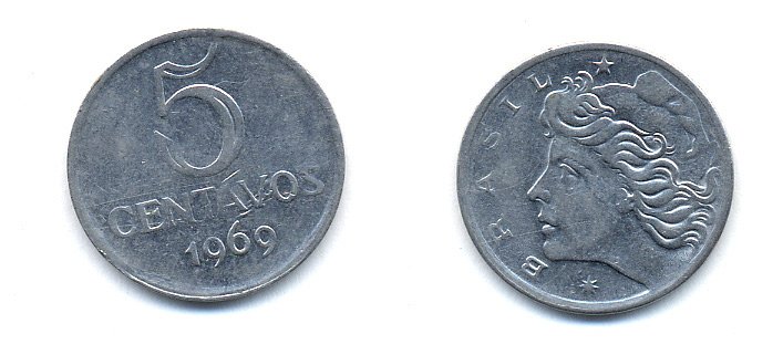 Бразилия 5 сентаво 1969 голова свободы влево KM 577.2, Schon 82a нержавеющая сталь 51-5123