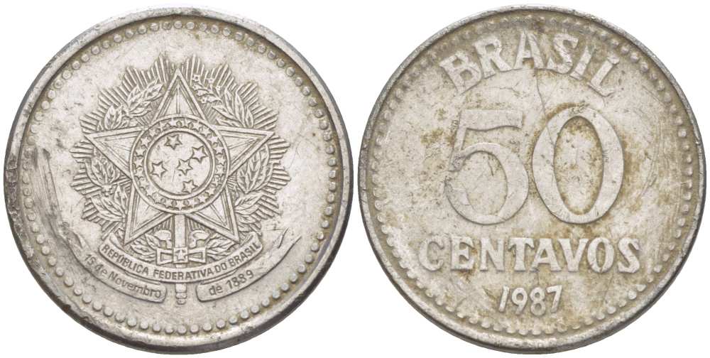 Бразилия 50 сентаво 1987 реформа 1986-1989 KM 604 нержавеющая сталь 3334-443