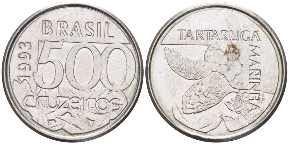 БРАЗИЛИЯ 500 КРУЗЕЙРО 1993 РЕФОРМА 1990-1993, МОРСКАЯ ЧЕРЕПАХА KM 624 нержавеющая сталь 4396-1014