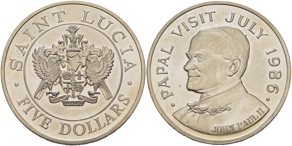 СЕНТ-ЛЮЧИЯ 5 ДОЛЛАРОВ 1986 ВИЗИТ ПАПЫ ИОАННА ПАВЛА II KM 14 медно-никель UNC 1081-4-41
