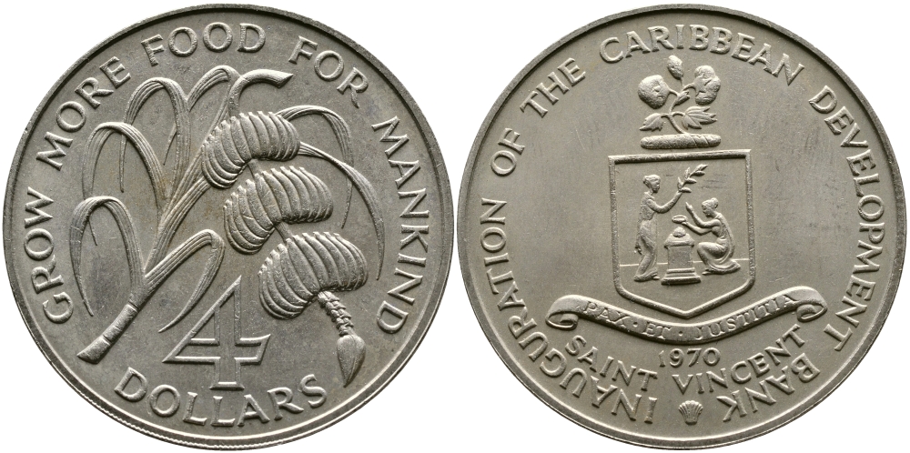 Сент-Винсент 4 доллара 1970 FAO, открытие Карибского Банка Развития KM 13 медно-никель UNC 00-000-00