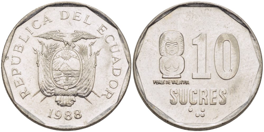 ЭКВАДОР 10 СУКРЕ 1988 VENUS DE VALDIVIA KM 92.1 сталь плакированная никелем 31-432