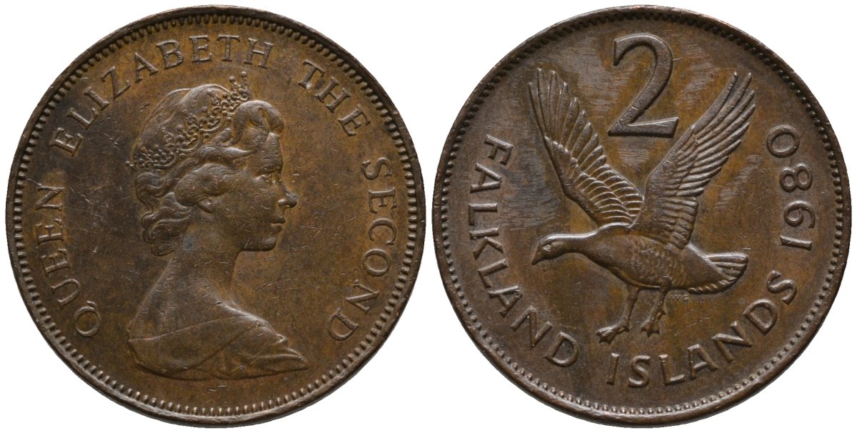 Фолклендские острова 2 пенса 1980 Елизавета II (1952-2022), магелланов гусь KM 3 бронза 4577-553