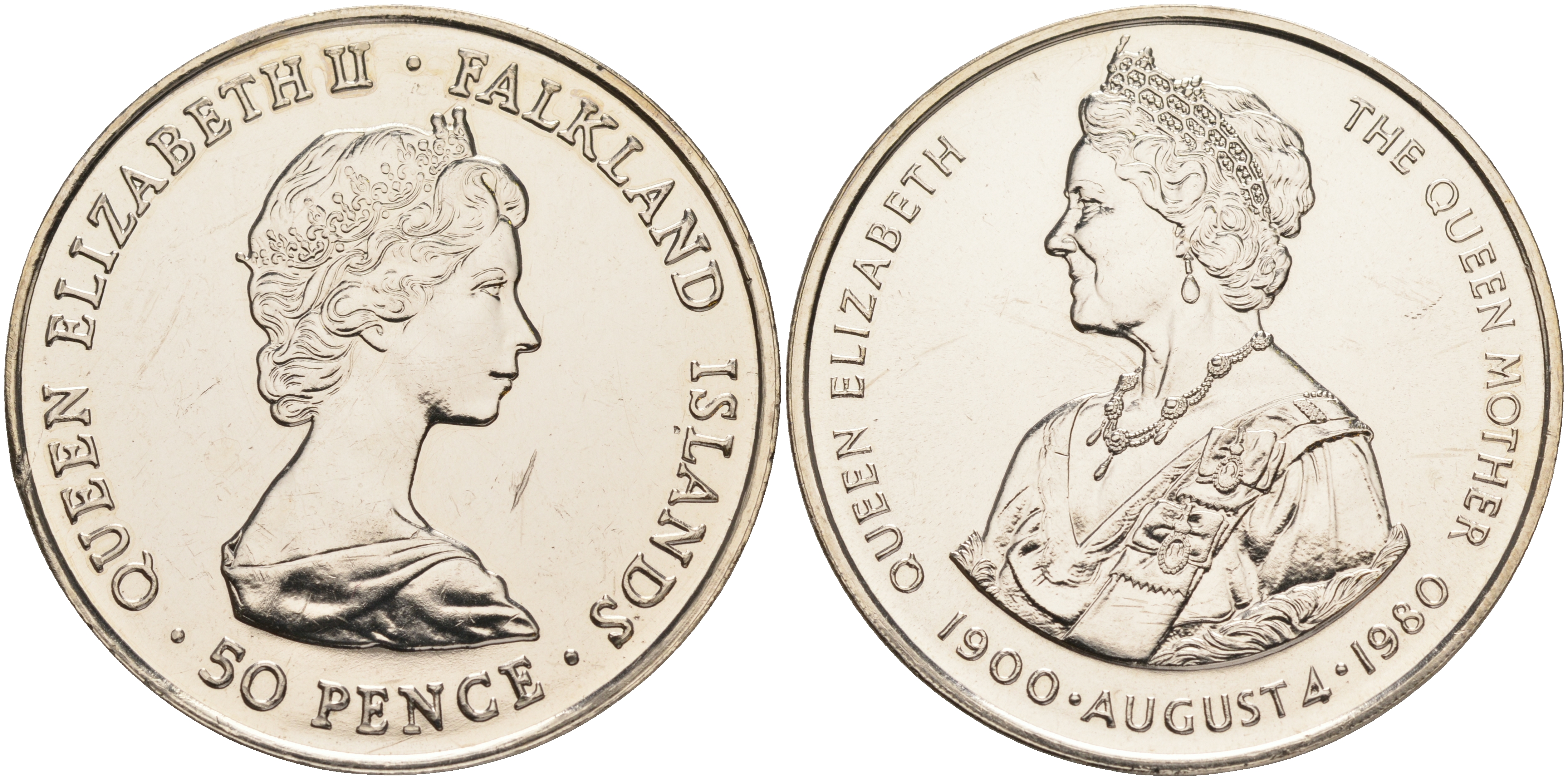 ФОЛКЛЕНДСКИЕ ОСТРОВА 50 ПЕНСОВ 1980 80 ЛЕТ КОРОЛЕВЕ ЕЛИЗАВЕТЕ - КОРОЛЕВЕ МАТЕРИ KM 15 медно-никель UNC 4558-825