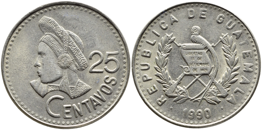 Гватемала 25 сентаво 1990 большая голова, Республика Гватемала KM 278.5 медно-никель 4389-422