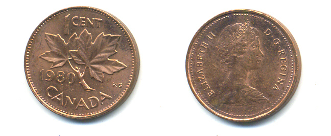 КАНАДА 1 ЦЕНТ 1980 ЕЛИЗАВЕТА II (1952-), КЛЕНОВЫЙ ЛИСТ KM 127 бронза 177-1356
