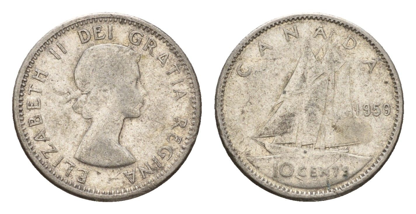 Канада 10 центов 1959 Елизавета II (1952-2022), парусник KM 51 серебро 99-814